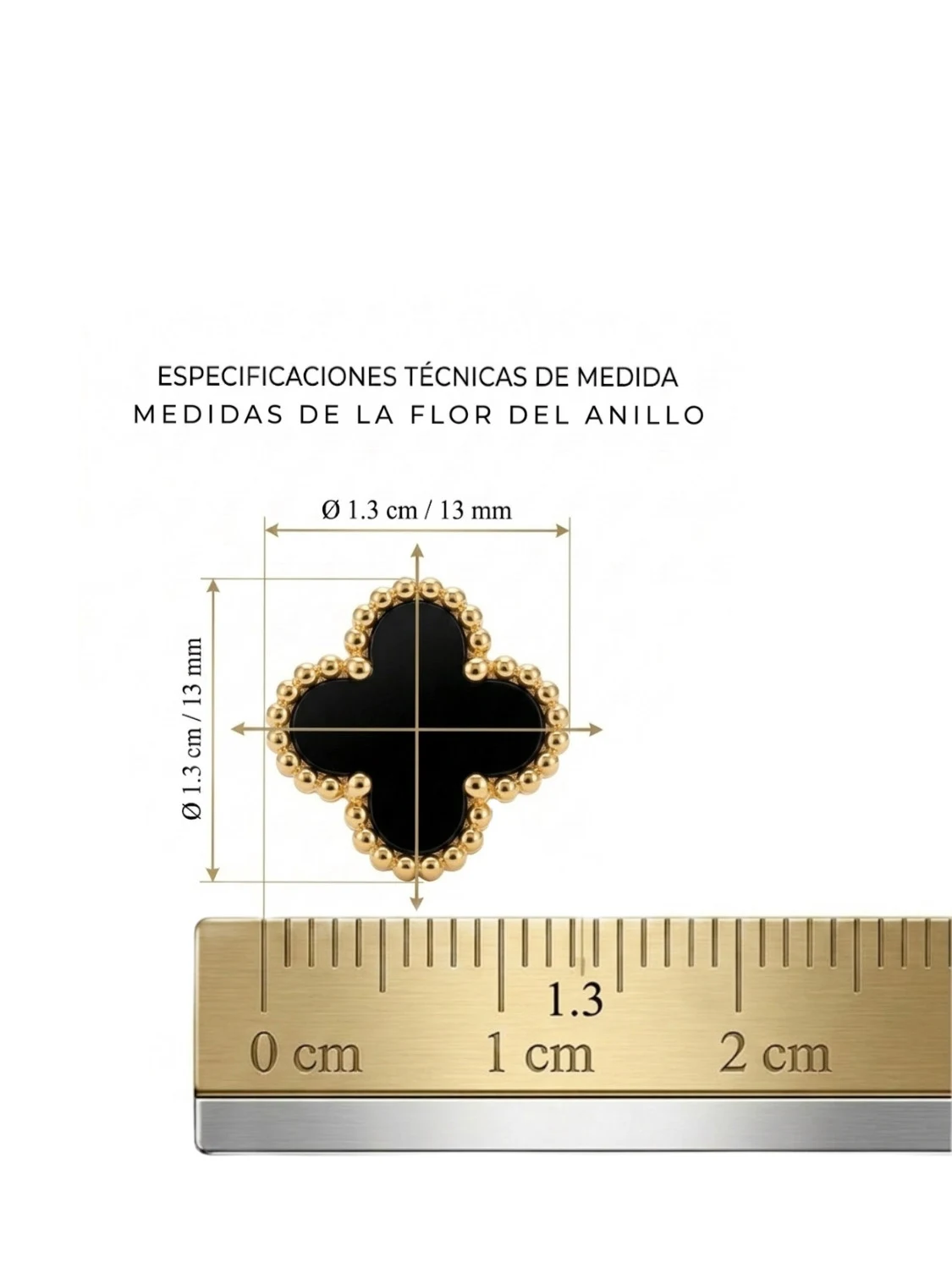 • Diseño atemporal: pieza inspirada en la alta joyería con motivo de trébol de cuatro hojas en resina negra profunda, enmarcado por un delicado borde de esferas doradas.