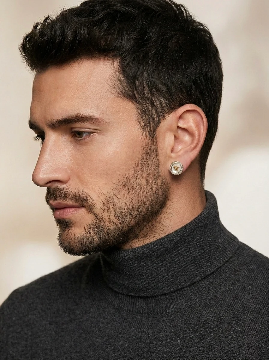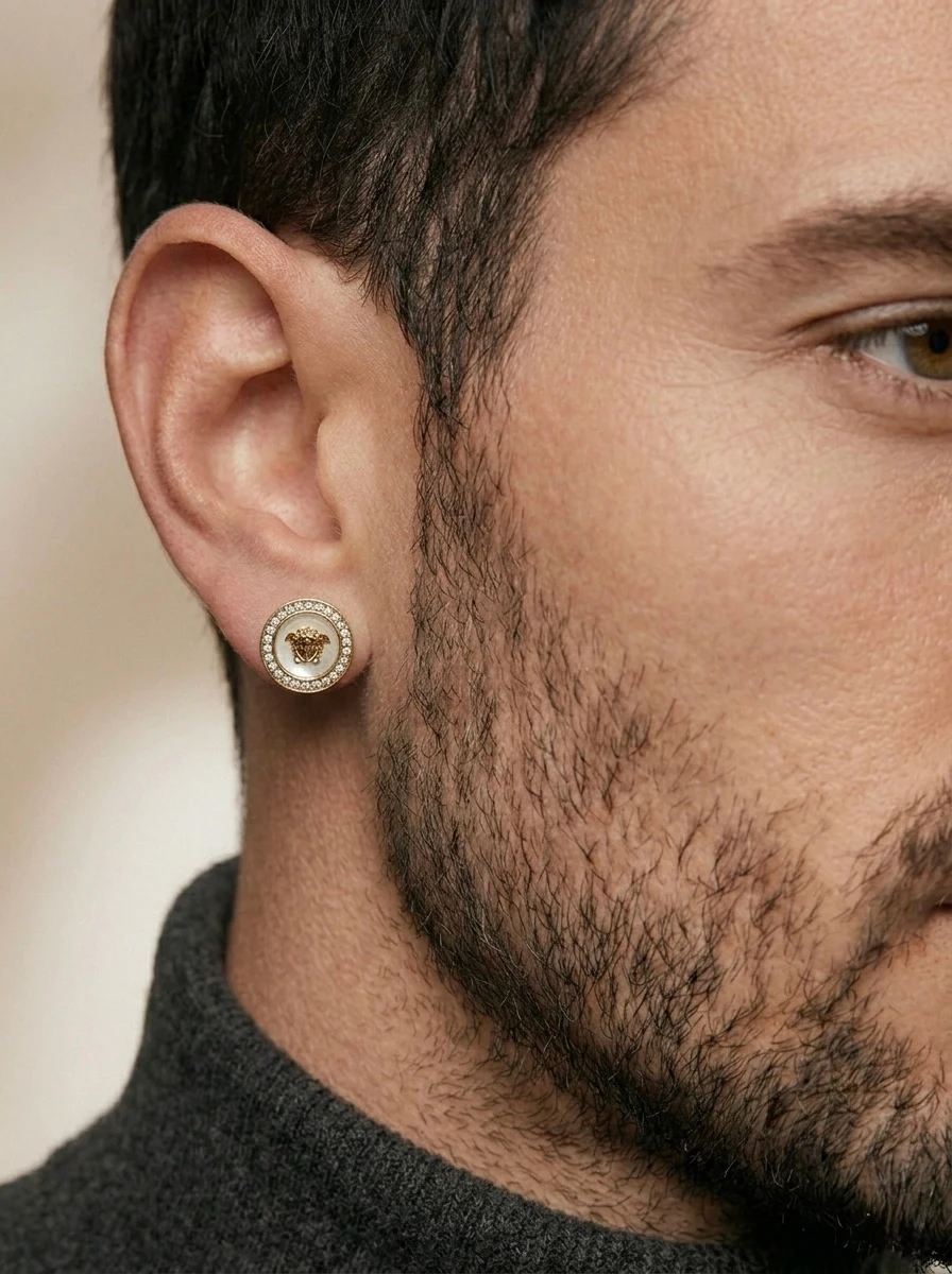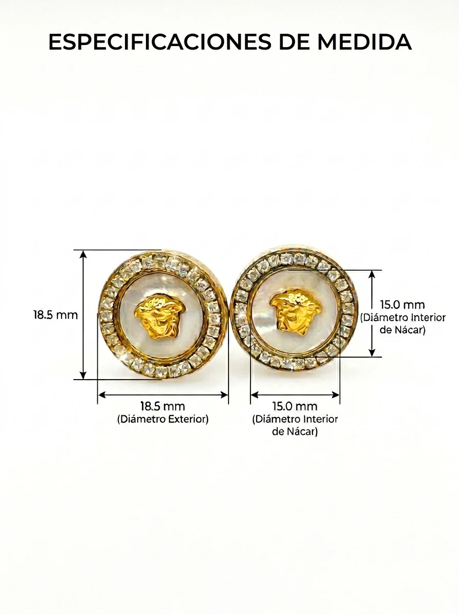 Eleva tu estilo con estos impresionantes pendientes de botón, diseñados para quienes buscan un toque de lujo y distinción inspirada en la alta joyería italiana. El centro presenta el icónico relieve de la Medusa en tono dorado, realzado sobre un fondo de madreperla que aporta un brillo sutil y natural.